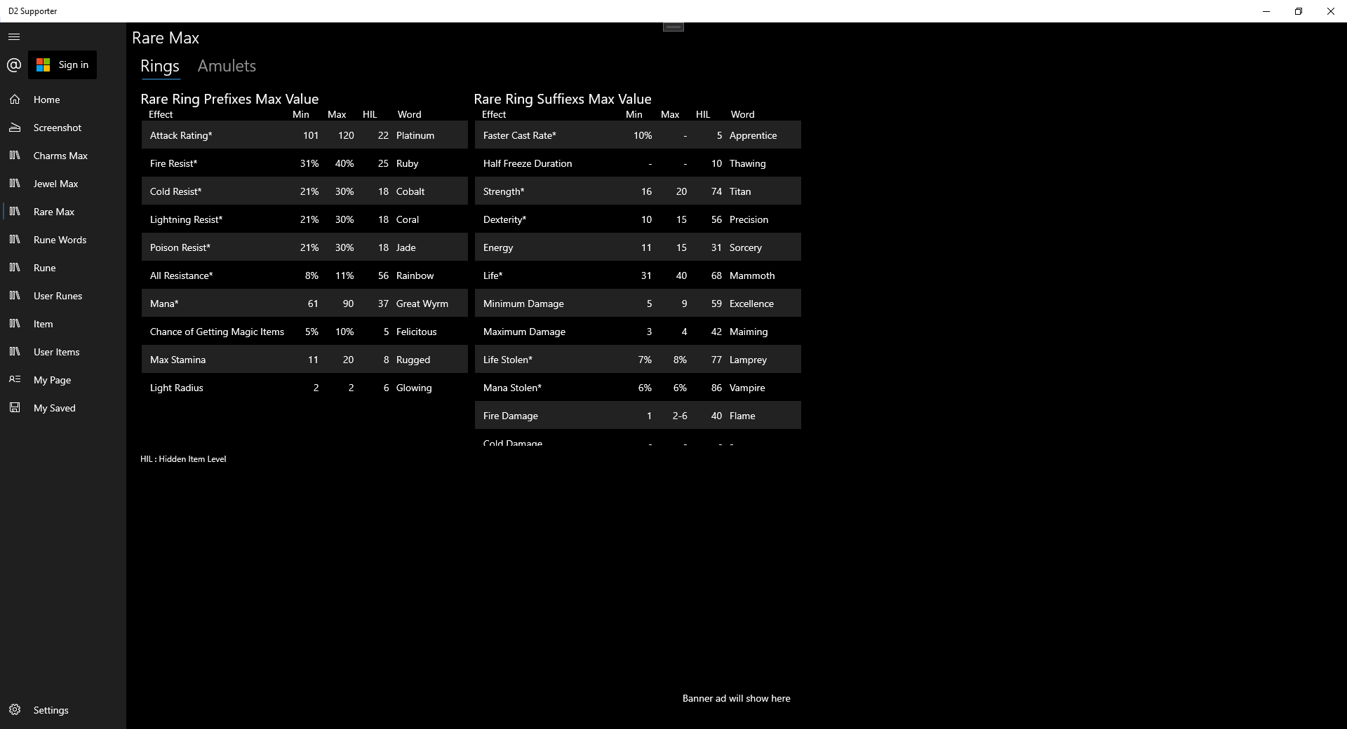 - Added a page to see the maximum value for each effect of Rare Ring and Rare Amulets